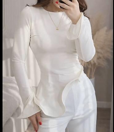 Блуза с асимметричным баской и длинным рукавом - Цвет: молочный/белый (на модели также показан вариант в пастельно‑жёлтом). - Силуэт: приталенный, визуально подчеркивает талию; мягкая драпировка п...