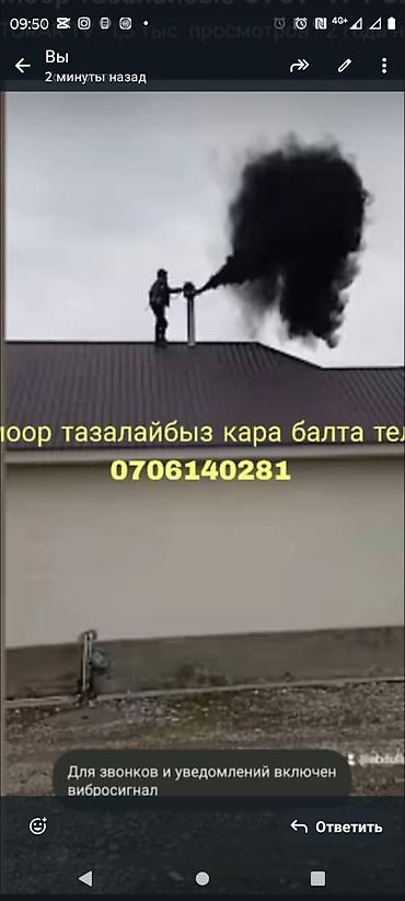 Также на изображении показана услуга очистки дымоходов: специалист выполняет чистку трубы на крыше с удалением сажи и копоти для улучшения тяги и безопасности отопления.