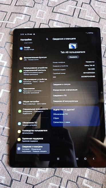- На экране изображено меню “Сведения о планшете”: Galaxy Tab A8, модель SM‑X205.