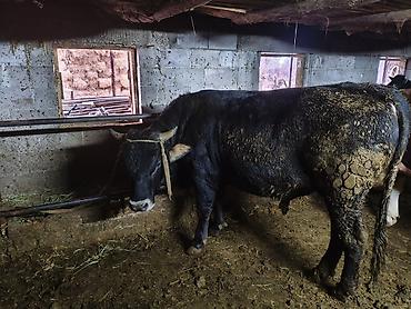 Быки на откорм порода швец смешка ала тоо - Молодняк КРС черного окраса, рогатые. - Содержатся в крытом коровнике, на привязи у кормушек. - Рацион: сено/солома (на фото видно кормушки с грубым корм...