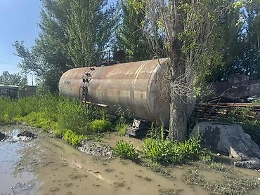 Металлическая цилиндрическая резервуарная емкость для ГСМ/воды Характеристики: - Тип: стальной горизонтальный резервуар цилиндрической формы - Ориентировочный объем: около 20–30 м³ (по пропорциям ...