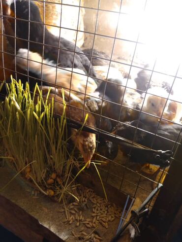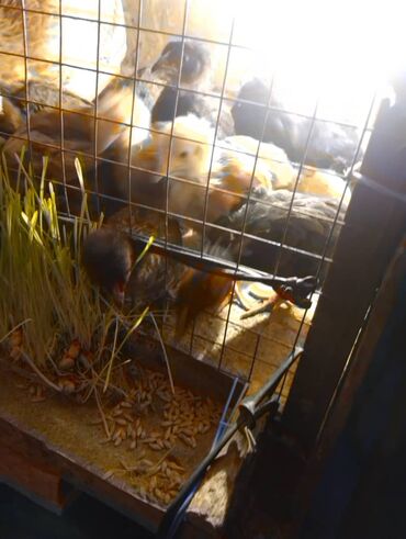 Для разведенияЦыплята разных окрасов (черные, рыжие, пестрые) в клеточном содержании. На фото — молодняк мясо-яичных пород, дамашний выращенный на комбикорме и зерносмеси, с добавлением зелени (пророщенное зерно видно в кормушке). Освещение и обогрев лампой. Активные, подвижные, дружно едят.