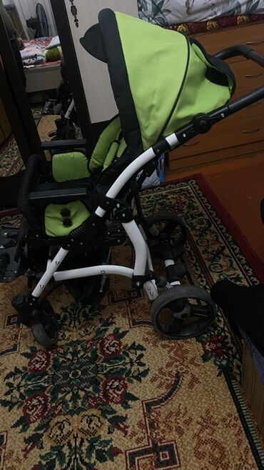 Универсальная детская коляска 2-в-1 (люлька + прогулочный блок), цвет хаки/оливковый. Основные особенности: - Шасси из легкого металла с лаконичным дизайном, центральный замок фиксации блока. - Бо...