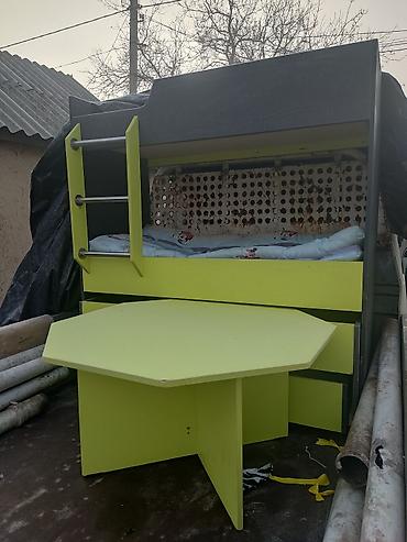- Письменный/игровой стол: отдельный многоугольный стол в том же салатовом цвете, устанавливается перед кроватью — удобно для уроков и игр.