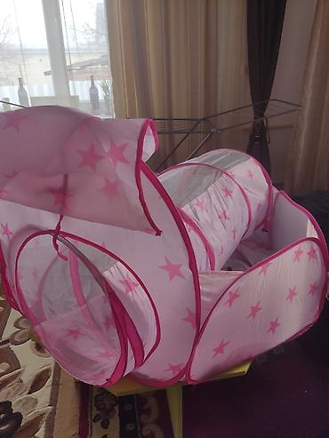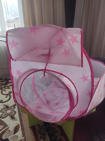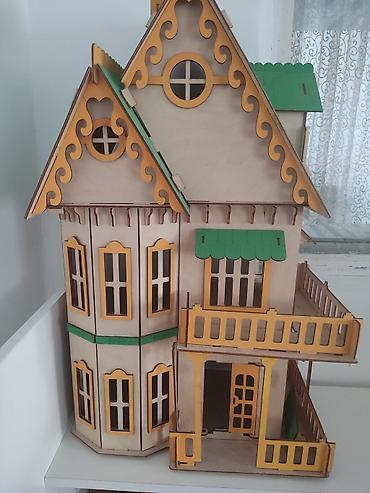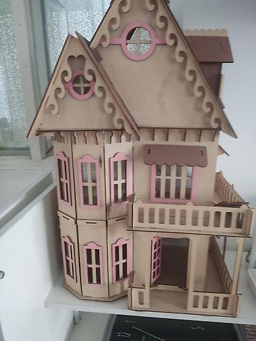 - Кукольный домик: большой, деревянный, с декоративными элементами, фасады с розовыми вставками, балкон и терраса, распашные окна и двери. Подходит для игр и как украшение детской.