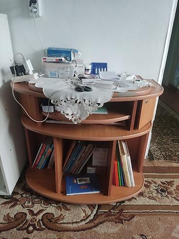 - Комод/тумба под технику и книги: двухъярусная, овальная форма, полки для хранения, дерево/ЛДСП под бук. Нижние секции разделены перегородками — удобно для тетрадей и книг.
