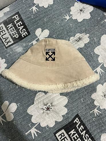 - Сторона 2: замша/велюр бежевого оттенка с вышивкой логотипа Off-White на тулье; по краю — пушистая кромка из шерпа
