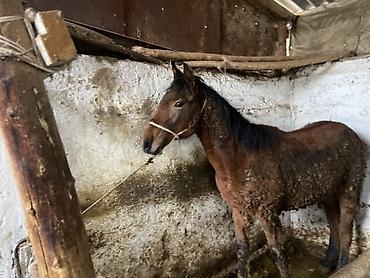 Молодая лошадь (жеребёнок/подросток), масть гнедая.