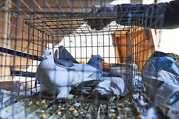 Породистые голуби (вероятно почтового/спортивного направления). Описание: - Окрас: серый, тёмно-серый (графит), светло-серый с двумя поперечными полосами на крыльях, а также белые особи. - Коренас...