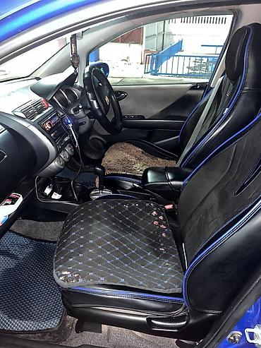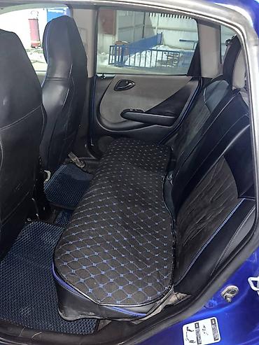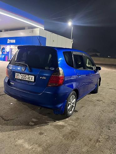 Honda Fit 2005 рестайлинг, 5‑дверный хэтчбек, правый руль. Яркий синий цвет кузова, дефлектор‑мухобойка на капоте с надписью FIT.