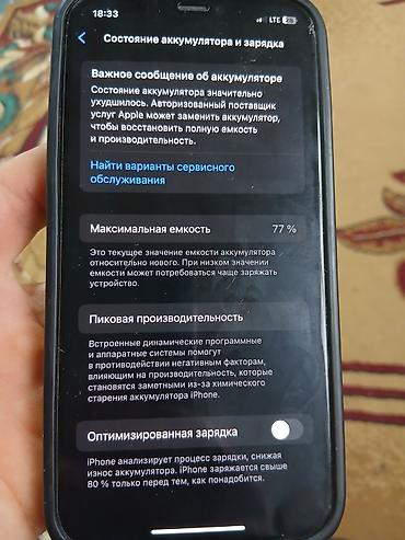 Состояние аккумулятора по меню iOS: максимальная ёмкость 77%. На экране «Состояние аккумулятора» отображается сообщение о необходимости обслуживания аккумулятора. Включена опция «Оптимизированная зарядка».