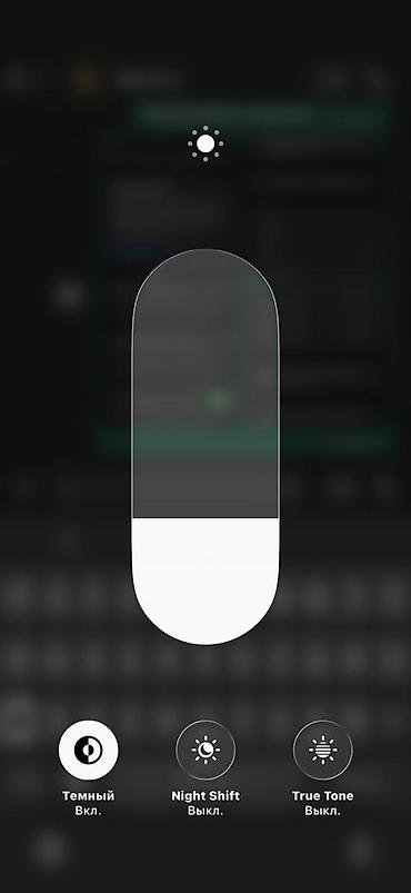 - Экран: , OLED Super Retina XDR. На скриншоте видно панель яркости; режим «Тёмный» включён, Night Shift и True Tone — выключены.