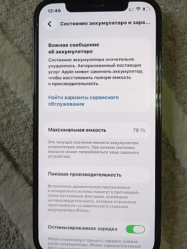 - Состояние аккумулятора по меню «Аккумулятор»: максимальная емкость 78%, есть системное сообщение о необходимости обслуживания; включена «Оптимизированная зарядка».