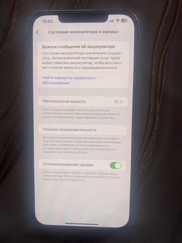 - Аккумулятор: максимальная ёмкость 76%, включена «Оптимизированная зарядка»