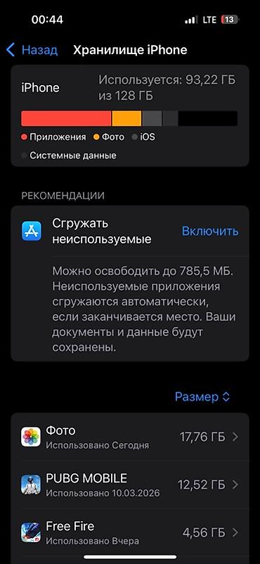 - На скриншотах «Об этом устройстве» и «Хранилище iPhone» видно: используется 93,22 ГБ из 128 ГБ; установлены приложения и игры, фото и видео.