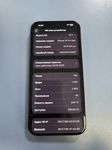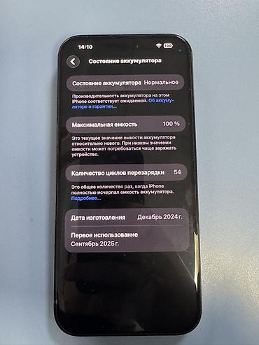 Смартфон iPhone 16 Pro Max в черном цвете с объемом памяти 256 ГБ. Устройство работает на iOS версии 26.2. Отличается отличным состоянием аккумулятора с максимальной емкостью 100% и всего 54 циклами перезарядки. Модель произведена в декабре 2024 года и была впервые использована в сентябре 2025 года. Имеет тройную основную камеру.
