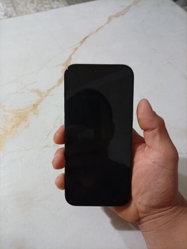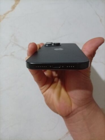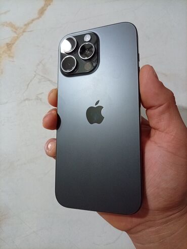 IPhone с тройным модулем камер, корпус из матового стекла и плоских стальных граней. Цвет — темно‑серый/черный. Порт USB‑C, стереодинамики. На экране — вырез под фронтальную камеру (Dynamic Island).