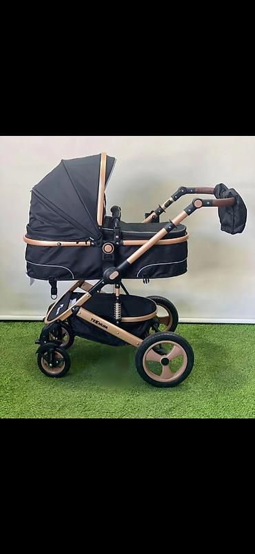 Детская коляска-люлька Teknum (модель на фото) - Тип: прогулочная система с люлькой (0+) - Рама: прочная алюминиевая, оформление в золотистом цвете - Колеса: большие задние и поворотные передние с...