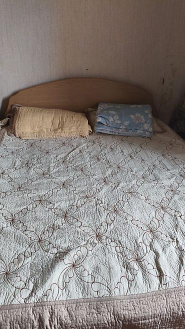 - Кровать двуспальная с изогнутым изголовьем из светлого ламинированного ДСП. На фото — просторное спальное место, покрыто стёганым пледом.
