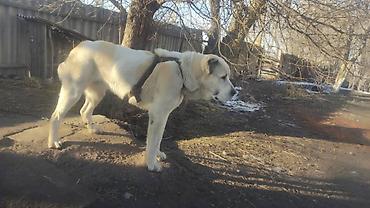 Крупная собака охранного типа. Окрас светлый (белый с кремовыми/бежевыми пятнами), коротко‑средняя густая шерсть. Сильный костяк, широкая грудь, мощная шея. Голова крупная, уши укороченные, хвост средней длины. На фото в прочной шлейке.