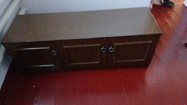 - Комод-тумбу низкую с четырьмя дверцами и кольцевыми ручками — удобен как подставка под ТВ или для хранения.