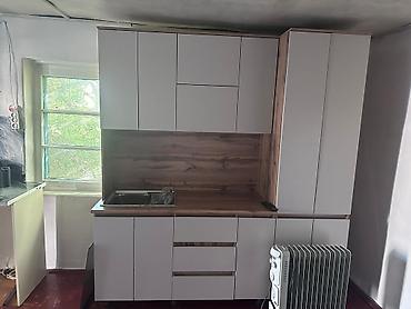 - Кухонные шкафы рассчитаны на базовую технику и хранение; рабочая зона с мойкой и длинной столешницей.