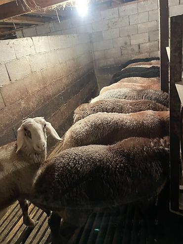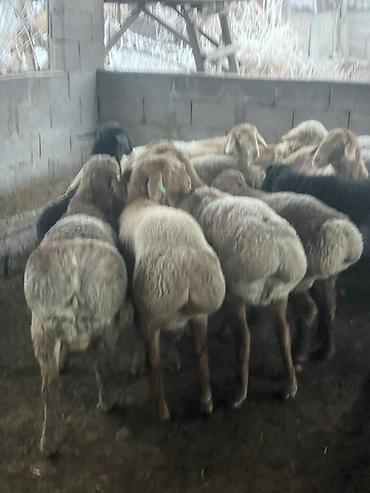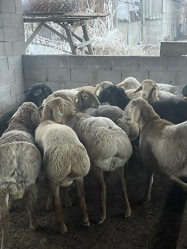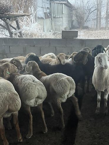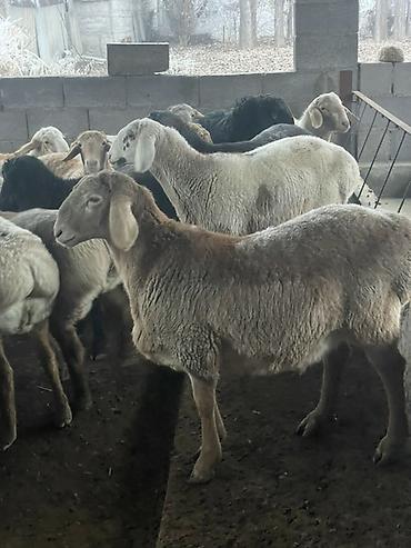 Овцы курдючные, стадо смешанных окрасов (белые, светло‑бурые, чёрные). Крупные, мясо‑сальные типы с выраженным курдюком. Уши длинные отвислые, шерсть короткая полутонкорунная/покровная, удобны для содержания в стойле и на выпасе. На фото — несколько десятков голов разного возраста. Живут в крытом загоне, метки в ушах стоят.
