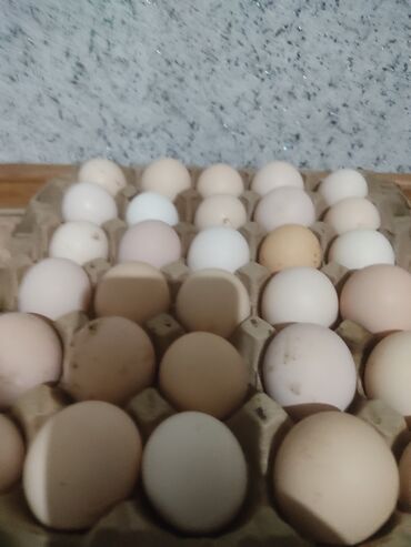 - Яйца деревенские, разного оттенка скорлупы (белые, кремовые, бежевые) — натуральная кормовая база без комбикормов промышленного типа.