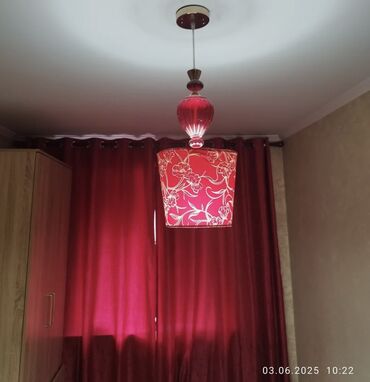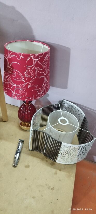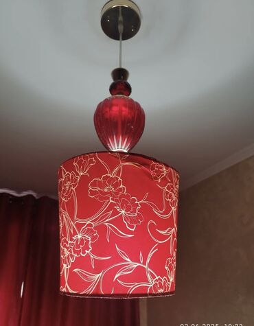 - Абажур: тканевый, цилиндрический, насыщенно‑красный цвет с белым флористическим узором
