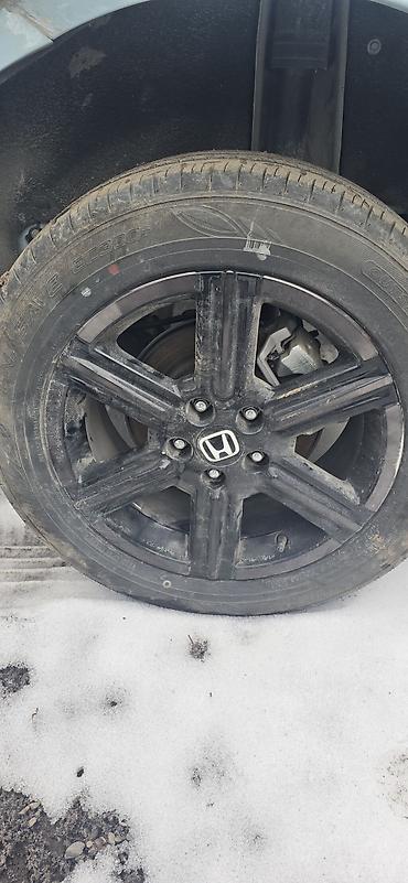 Литые диски Honda, 5 спиц, черные с декоративными проточками. Оригинальные колпачки с логотипом H. Разболтовка 5x114.3 (по фото — 5 отверстий под болты). Центр. отверстие и вылет не указаны на фото.