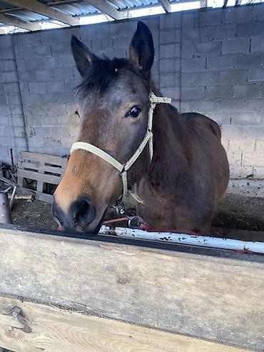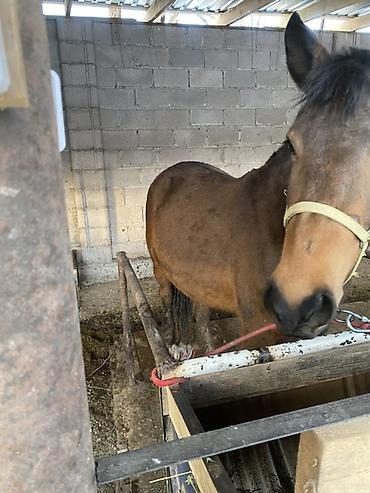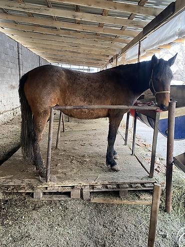 Лошадь (мерин/кобыла не указано), масть гнедо-бурая. На фото — в недоуздке, стоит на привязи в крытом деннике/навесе.