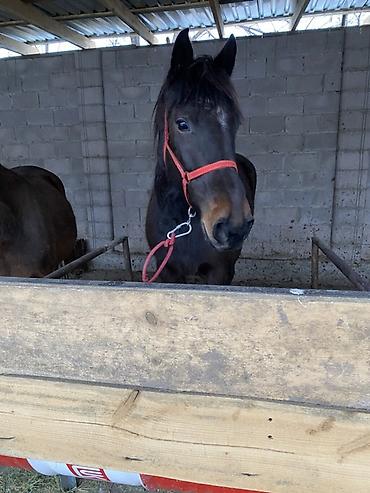 Возраст 4/5Лошадь темной масти (вороно-караш), на фото в красном недоуздке. Статная, крупная, с мощным крупом и крепкими конечностями. Подходит для хозяйственных работ, прогулочного верхового использования и упряжи. Спокойный, уравновешенный тип, хорошо стоит на привязи, спокойно относится к чистке и уходу.