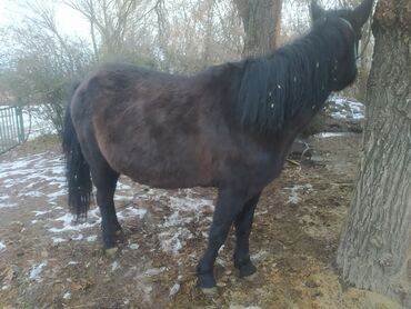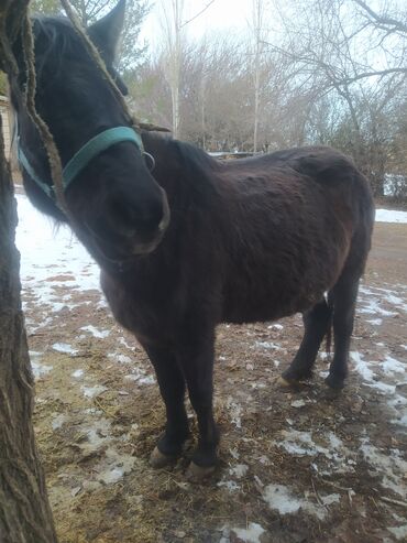 Лошадь тёмной масти с густой зимней шерстью. Крупный, широкотелый тип, мощный круп и глубокая грудь. Высокая густая грива и длинный хвост. На фото — коневязь, недоуздок из прочной стропы. Копыта крепкие, равномерно стоящие конечности.