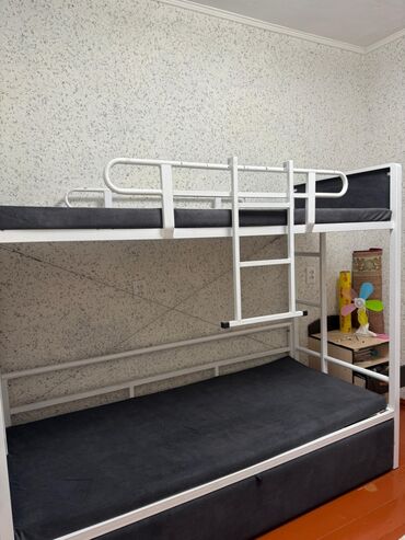 Металлическая двухъярусная кровать белого цвета, оснащенная выдвижным нижним ярусом и мягкими черными матрасами. Имеет устойчивую конструкцию с двумя спальными местами, а также дополнительное выдвижное третье место, что делает ее идеальным решением для экономии пространства в детской комнате или гостевой спальне. Верхний ярус оборудован ограждением для безопасности и лестницей для удобного доступа. Это функциональное решение для обустройства спального места.