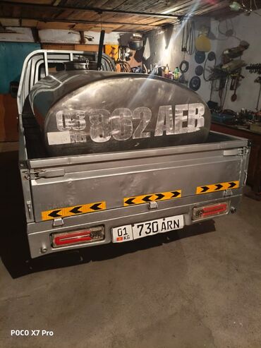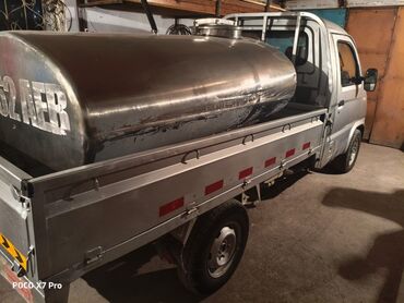 Мини-грузовик с открытым бортовым кузовом и установленной цистерной из нержавеющей стали.