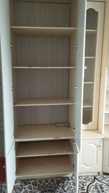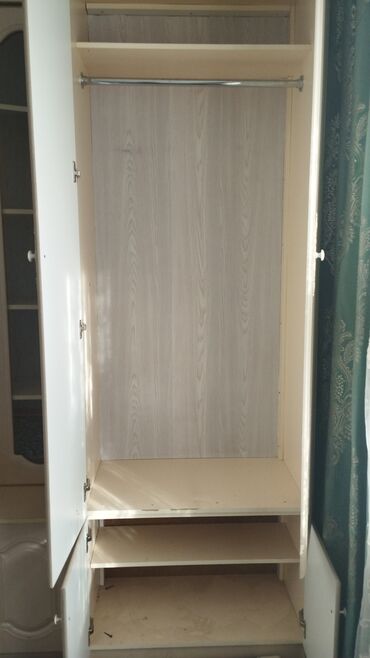 - Два высоких шкафа: один платяной с штангой для одежды и верхней полкой; второй – многоцелевой со множеством полок по всей высоте.