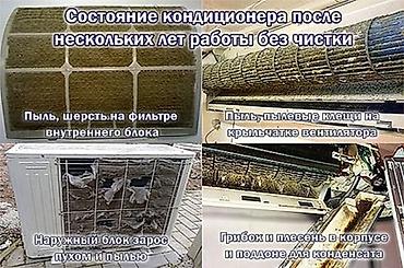 - Полная чистка и дезинфекция: разбор внутреннего блока, мойка испарителя и вентилятора, промывка дренажа, обработка антисептиком от грибка и плесени, очистка фильтров; сервис наружного блока и конденсатора.