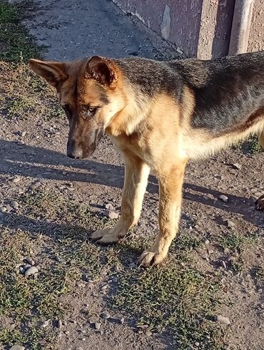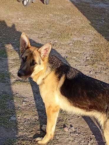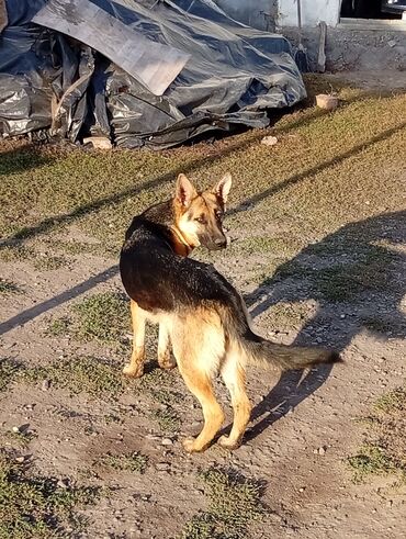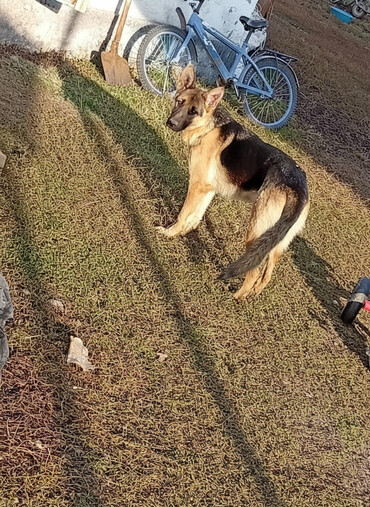 Немецкая овчарка, подросток (около среднего возраста между щенком и взрослой собакой). Окрас классический чепрачный: черная спина и круп, рыжие лапы, грудь и морда с темной маской. Пропорциональное сложение, высокая посадка ушей, длинный пушистый хвост. На фото видно: