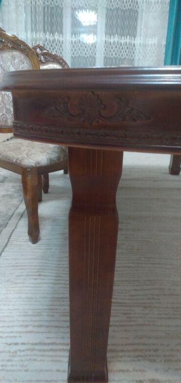 - Большой овальный стол из массива дерева с резным декором по царге и массивными прямыми ножками. Темный благородный оттенок, гладкая лакированная столешница с мягким скруглением кромок.