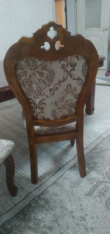 - Набор стульев с высокой спинкой: фигурные резные навершия, мягкие сиденья и спинки. Обивка — жаккард с узором «дамаск» в бежево-коричневой гамме, декоративная окантовка гвоздиками.