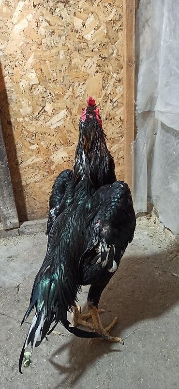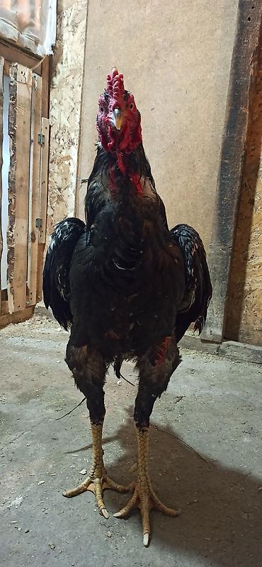 Петух бойцовой породы (вероятно, азиль/гамбургского типа). Характеристики: - Окрас: черный с зеленым отливом, красное лицо и гребень. - Высокие крепкие ноги желтого цвета, длинные пальцы, мощная ...