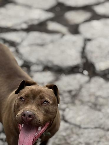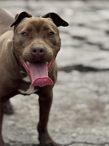 Кобель среднего размера с короткой коричневой шерстью и белой отметиной на груди. Атлетичное телосложение, мощная шея и грудь, широкая морда. Уши укороченные/естественно прилегающие. Глаза янтарные. Хвост естественный.