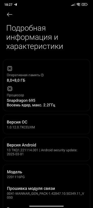 Смартфон POCO X6 Pro 5G Характеристики по устройству (см. скрин на фото «О телефоне»): - Модель: POCO X6 Pro 5G - Память: 256 ГБ + 6 ГБ ОЗУ (версия, указанная в системе) - ОС: Android (прошивка Hy...