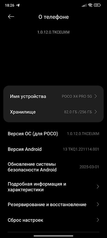 POCO X4 Pro 5G смартфон Основные характеристики: - Память: 256 ГБ встроенной, доступно ~68,6 ГБ свободно на момент снимка - Сеть: 5G - ОС: Xiaomi HyperOS (версия 1.0.8.0.TKCMIXM), Android 13 - Обн...