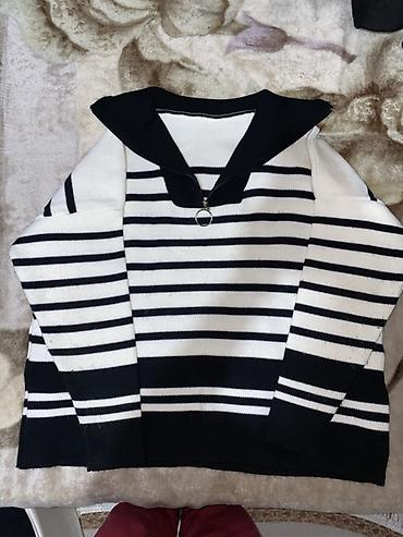 - Джемпер: чёрно‑белая полоска, плотная вязаная фактура. Ворот с отложным «морским» лацканом и короткой молнией спереди с кольцом‑пуллером. Длинный рукав, эластичные манжеты и низ.