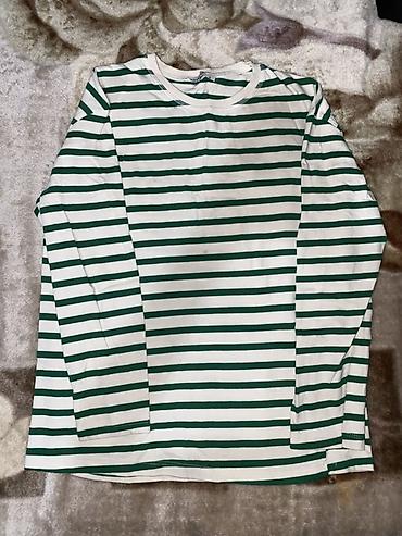 - Лонгслив 1: белый с зелёными горизонтальными полосами, длинный рукав, круглый вырез. Прямой крой, разрезы по бокам низа.
