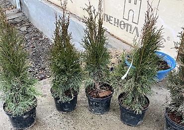 Рассада декоративных деревьев и кустарников для ландшафтного озеленения. Ассортимент на фото: - Хвойные в контейнерах: туя (шаровидные и конусовидные формы) — плотные, равномерные кроны, высота ор...