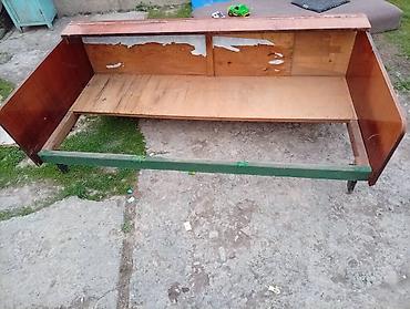 Диван‑кровать советского типа, деревянный каркас с боковинами, прямой подлокотник по обе стороны. Основание — дощатое/фанерное, спальное место — раскладное, с отдельным матрасным блоком. Спинка и царги из шпонированной древесины, передняя царга окрашена. Подходит как основа под реставрацию или для дачи/мастерской.