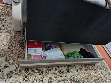Раскладной диван. Серый диван-кровать с тканевой обивкой, оснащенный механизмом трансформации для создания дополнительного спального места. Модель имеет встроенный ящик для хранения белья, что позв...