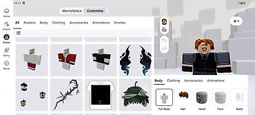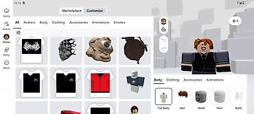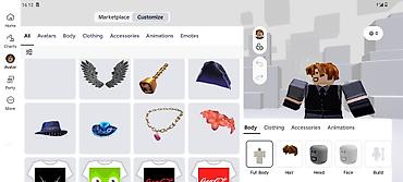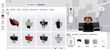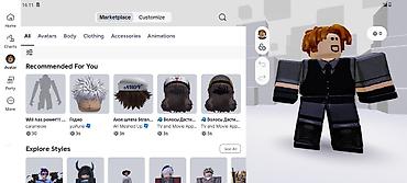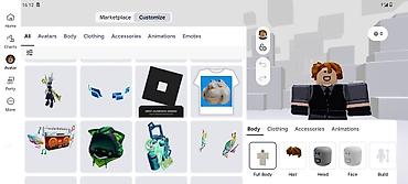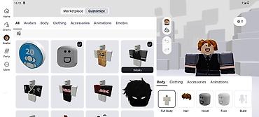 Аватар и элементы кастомизации для Roblox Описание: - Платформа: Roblox (мобильный интерфейс с вкладками Marketplace и Customize). - Возможности: полная кастомизация аватара через разделы Body, Cl...1 000 KGS